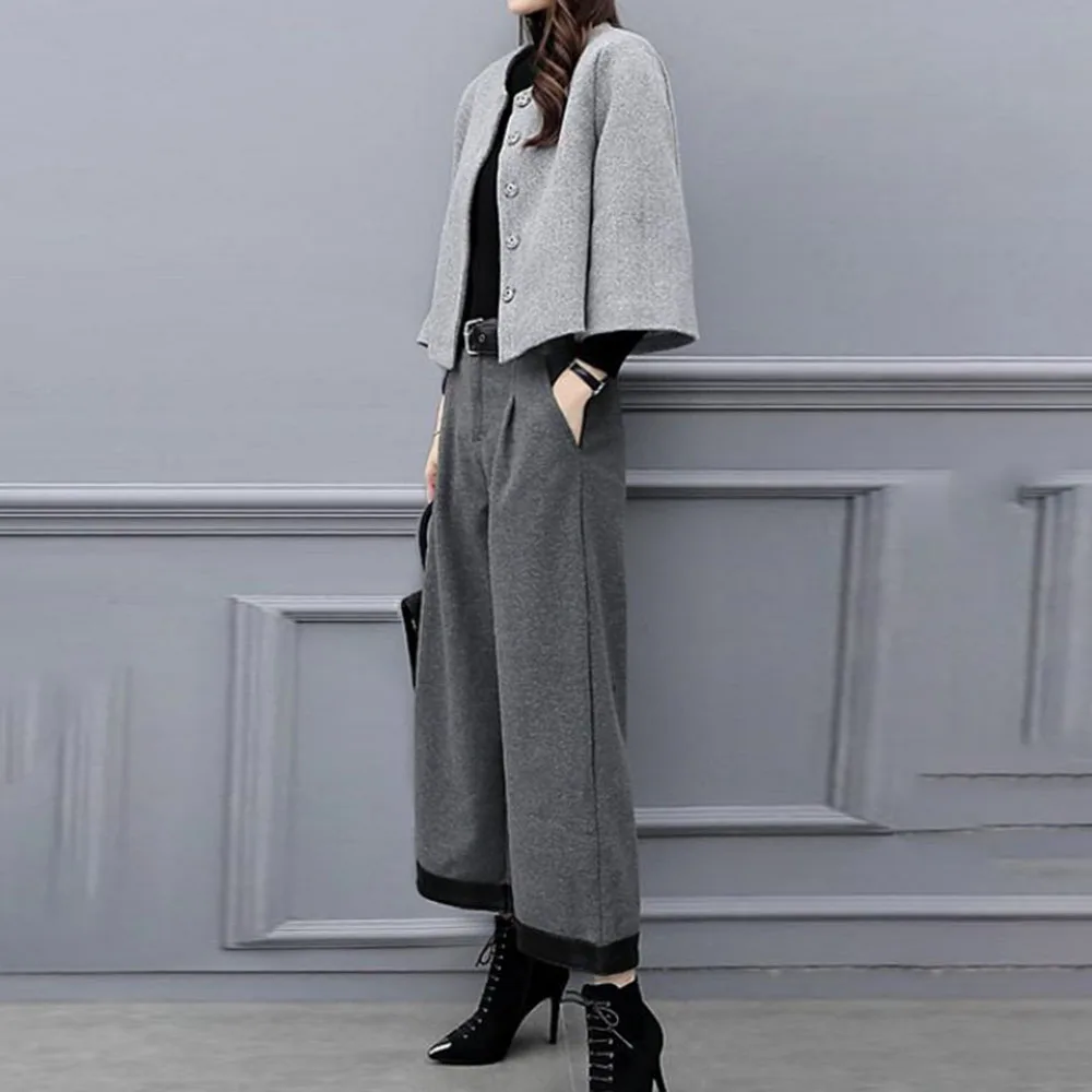 Promo Women Two Piece Set Winter Wool Blends Short Wool Coat Wide Leg Long Pants Sets Korean Office Fashion Casual 2 Pieces Suit