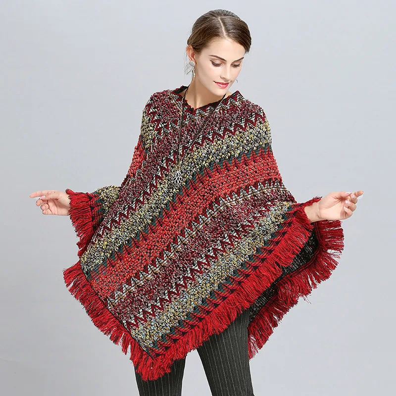 Sale 2020 Lady Knitted Poncho Hooded Autumn Winter Fashion Sweater with Tassels Casual Batwing Sleeves Pattern Pullovers