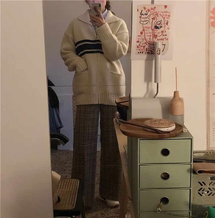Sale Harajuku 2020 autumn and winter korean style turn-down collar stripe zipper thick knittd cardigans womens sweaters womens