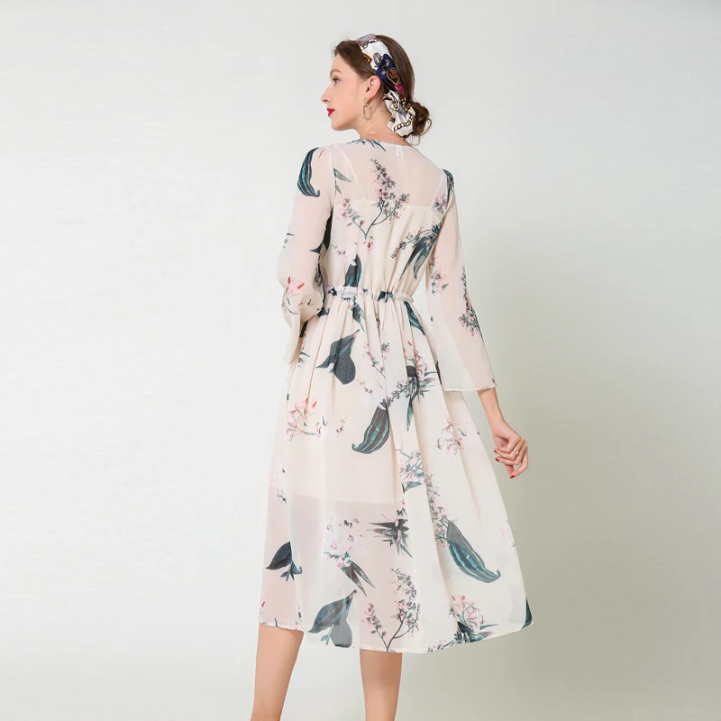 New Korean Fashion Women Dress Woman Chiffon Print Dress Plus Size Woman High Waist Belt Dresses Woman V Neck Floral Dresses Vestido
